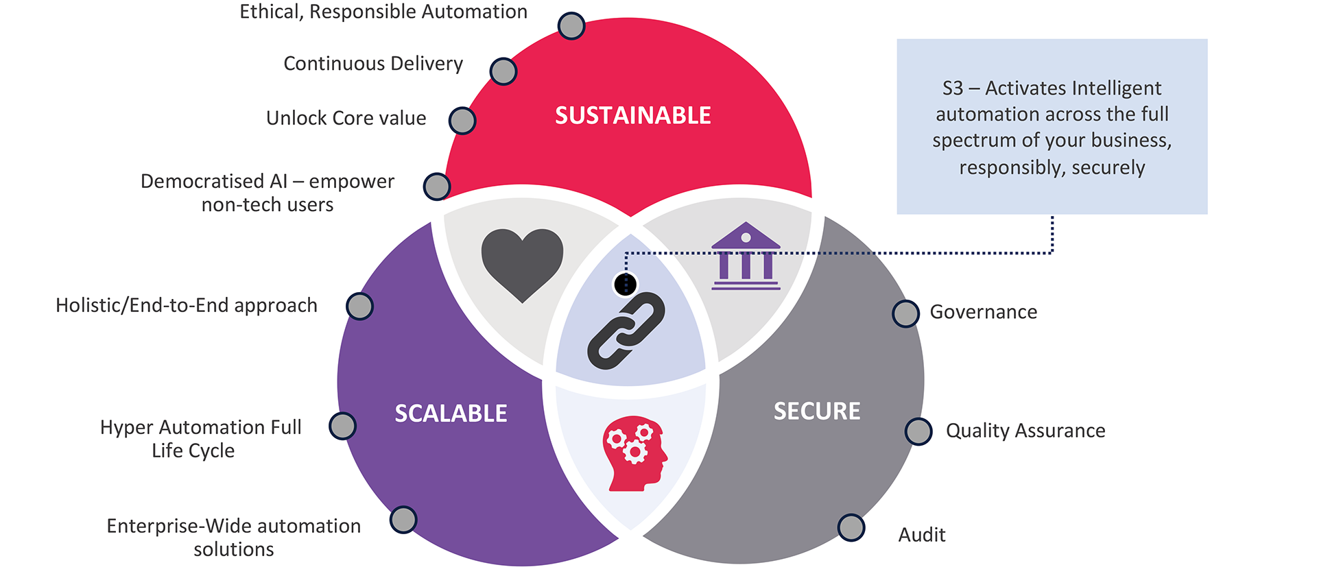 Following our S3 framework, we ensure our solution is secure in terms of governance, auditability, and quality. Our solutions are sustainable by responsibly factoring in human impact and company culture. We leverage continuous delivery, unlock core values, and democratise Artifical Intelligence by empowering non-technical users. Our solutions are scalable, achieving wins from small automation tasks to embedding intelligence into every process.